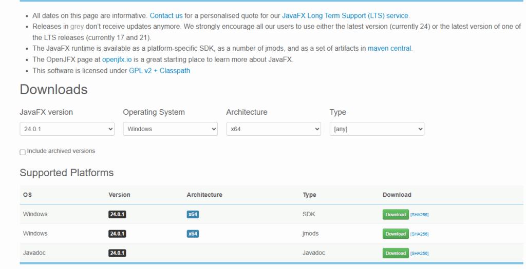 基于 Java 的跨平台特性,JavaFX 应用可以在多个操作系统上运行,如 Windows、macOS、Linux 等,确保应用的一致性和可移植性,可以从官网上下载对应版本和系统的 sdk,官网网址:https://gluonhq.com/products/javafx/