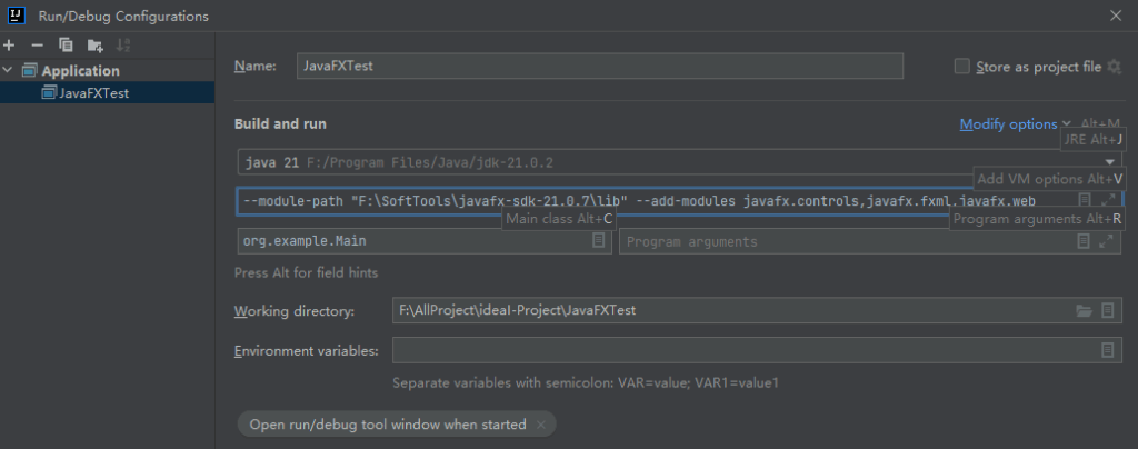 --module-path "F:\SoftTools\javafx-sdk-21.0.7\lib" --add-modules javafx.controls,javafx.fxml,javafx.web