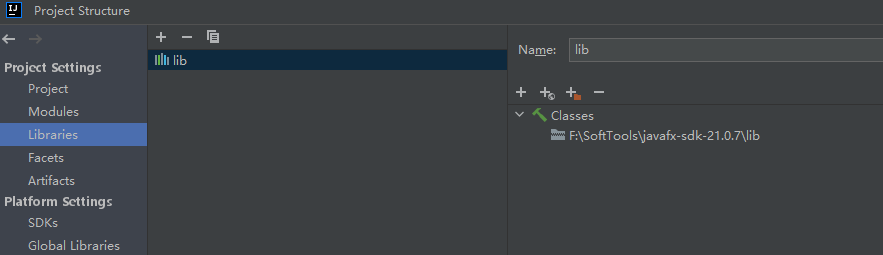 从 JavaFX 官网上下载 JavaFX SDK 并解压,然后在 File -> Project Structure -> Libraries -> + → 选择 JavaFX SDK 的 lib 目录下所有 jar 包,如图所示: