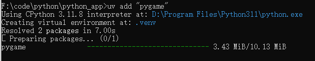 2.添加依赖模块,例如pygame,添加后会自动更新pyproject.toml和锁定文件(uv.lock):