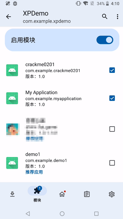 在上图中可以我设置模块作用的包名会有一个推荐应用的显示。