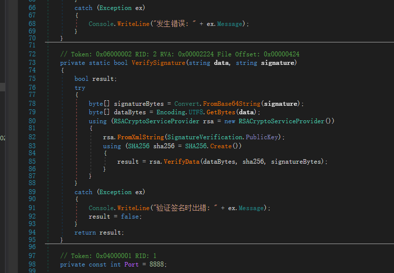 如果觉得采用上面的方案就可以保证我们接收到的数据不被篡改就大错特错了,我们想要解决接收到的数据被篡改的问题经常在网上查到的解决方案就是上面描述的内容,那我为什么说是大错特错了呢?下面我们以C#编写的程序为例,对其使用dnspy进行一下逆向分析看看
