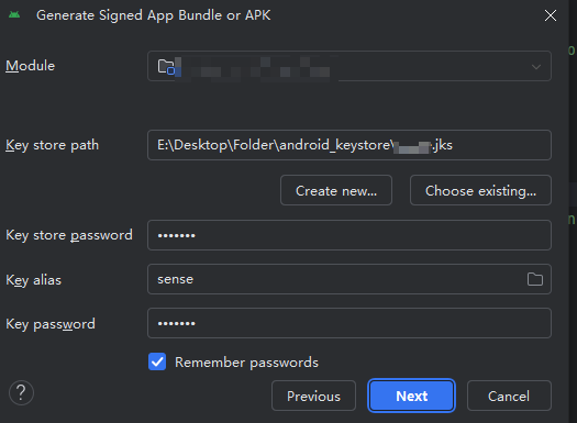 1.Android Studio生成apk/aab文件时可直接指定签名文件,输入签名文件的对应信息即可对程序进行签名: