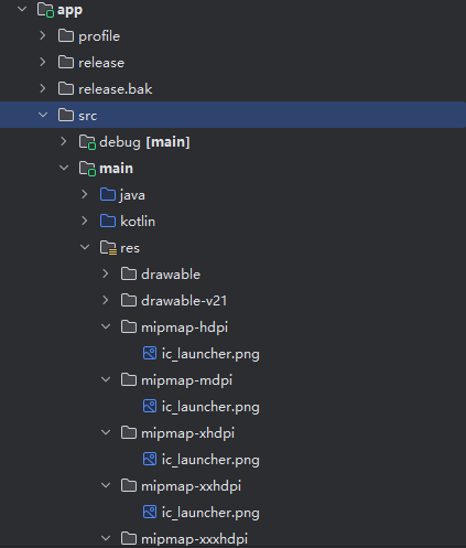 默认的应用图标是Flutter logo,将应用图标分别放置到/app/src/main/res/