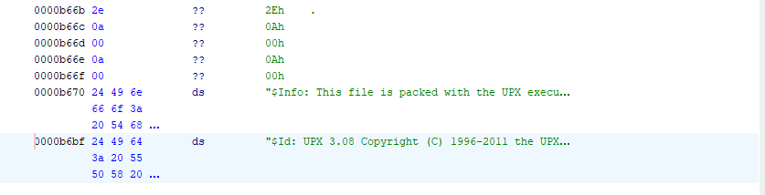 使用ghidra进行逆向分析,发现这并没有常规的代码,通过搜索程序中的字符串发现,这个程序使用upx 3.08进行压缩过。